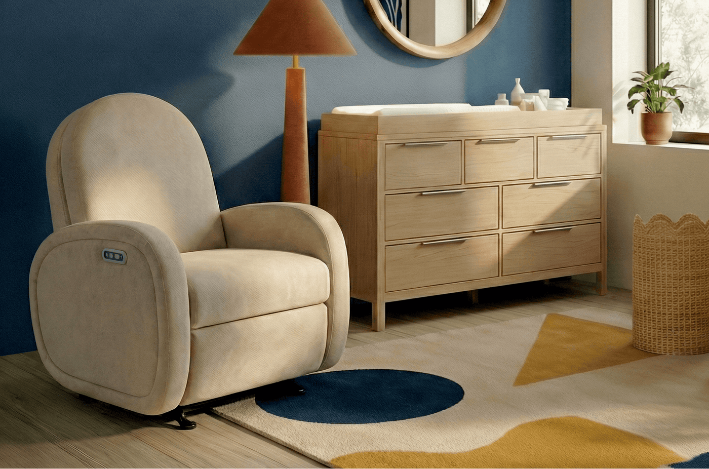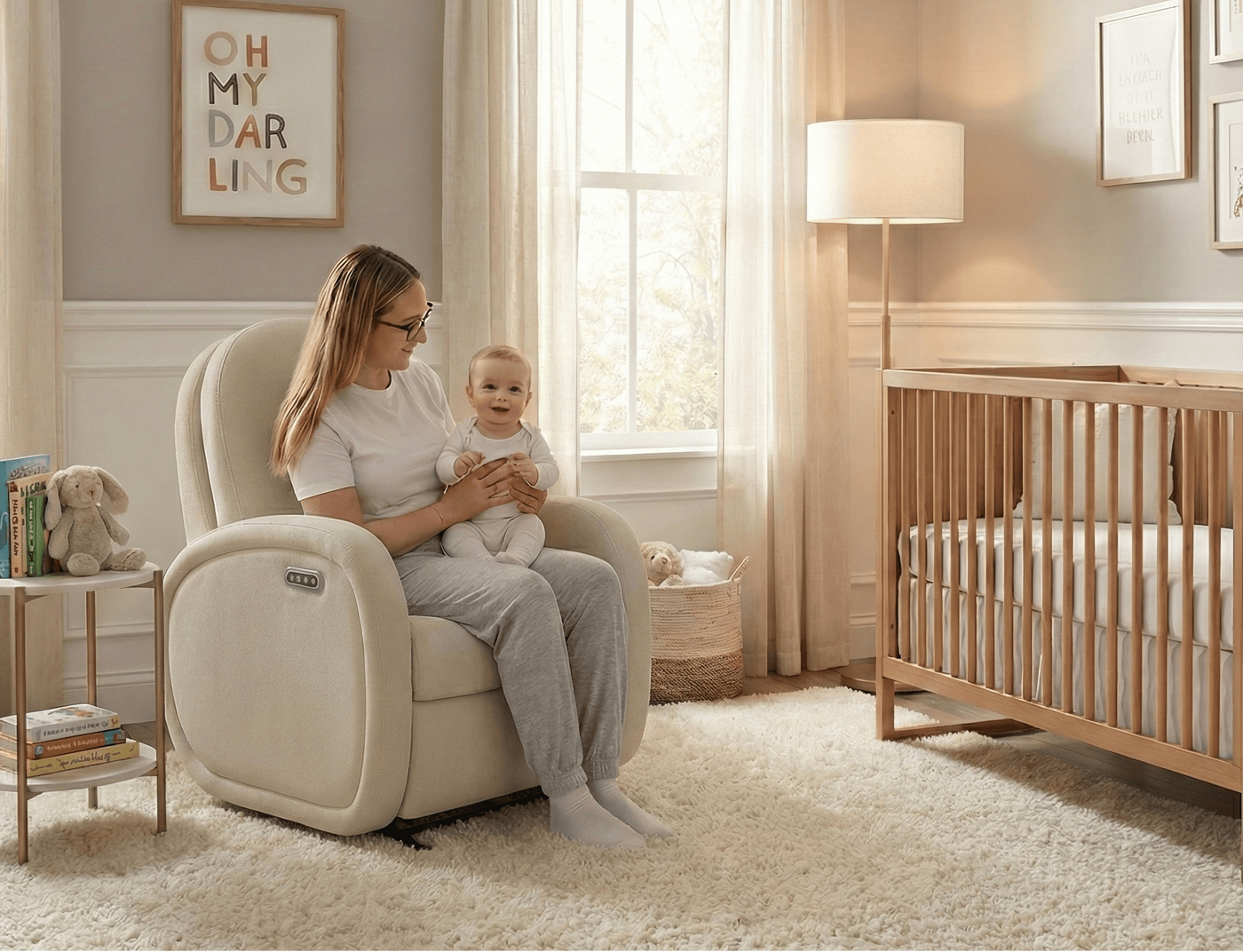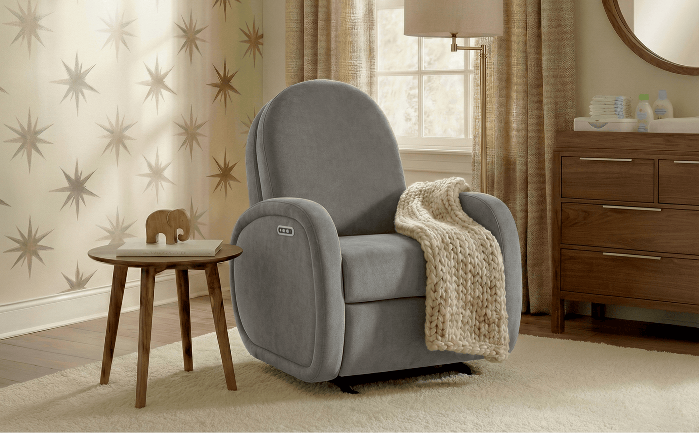 Designed by parents, for parents, The Austin Glider features soft curves, a supportive tall back, and smooth motion for everyday comfort.