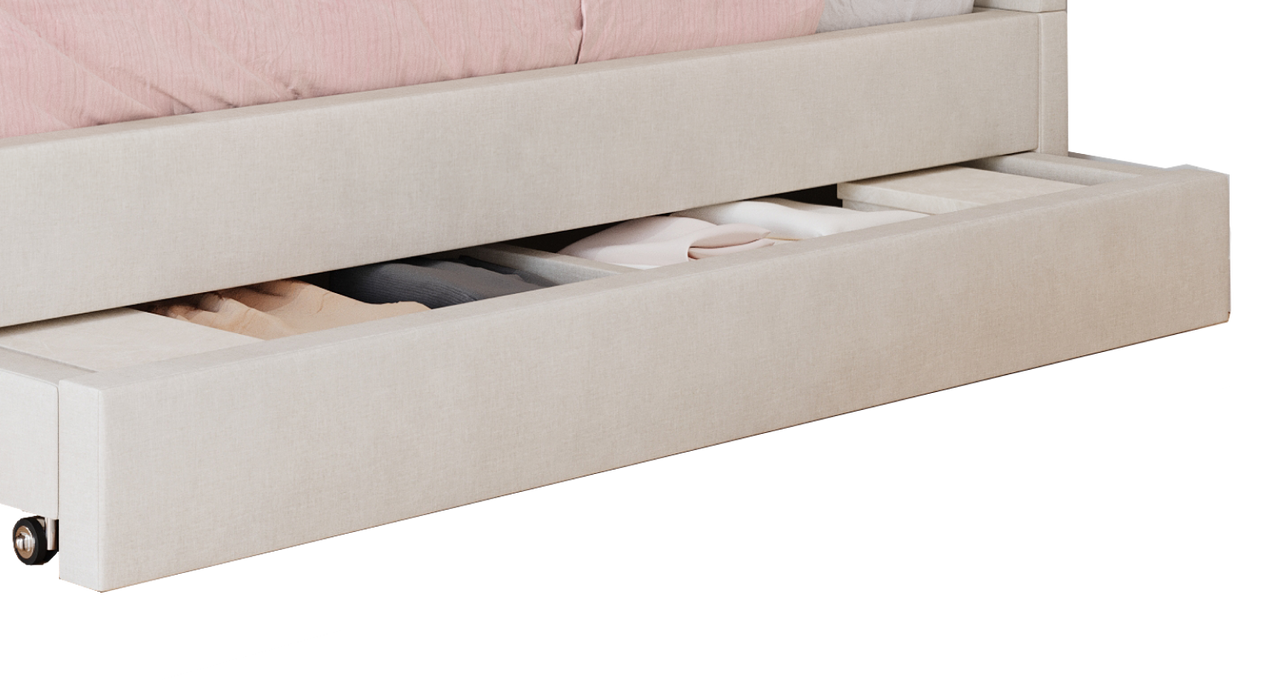 The bed features rounded corners in our signature stain-resistant fabric to keep your little one safe and cozy, and our matching add-ons allow this bed to grow with your family be it by adding safety guard rails or a storage trundle.