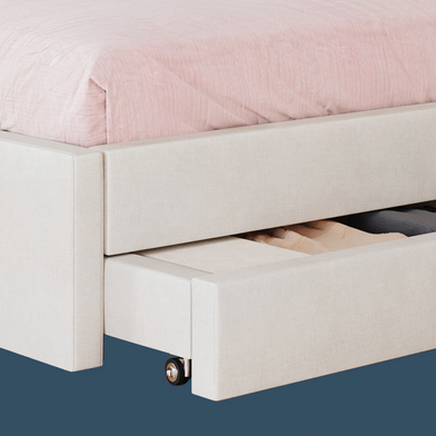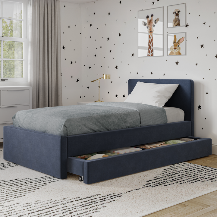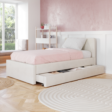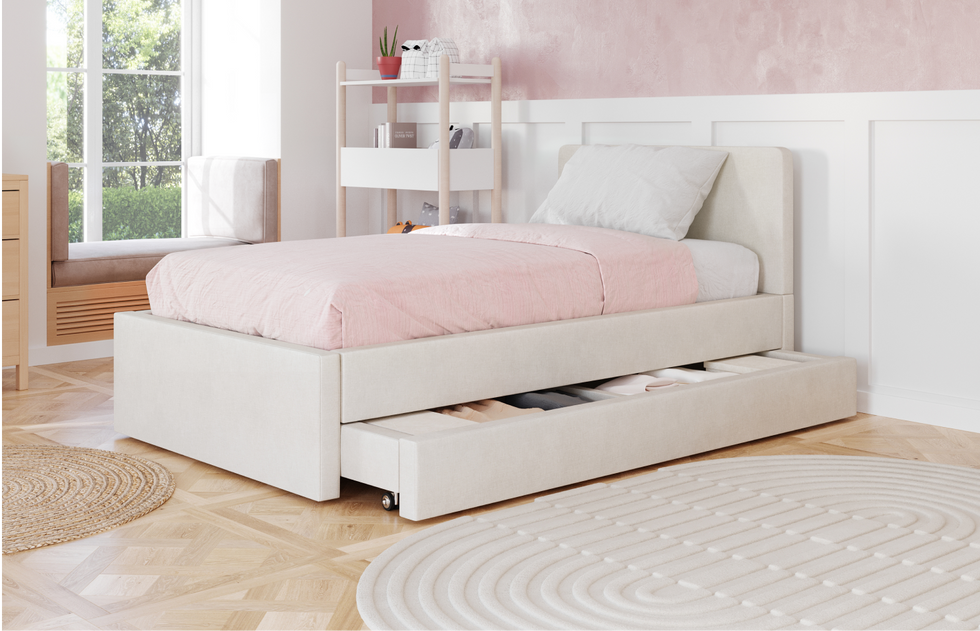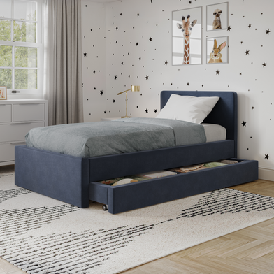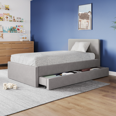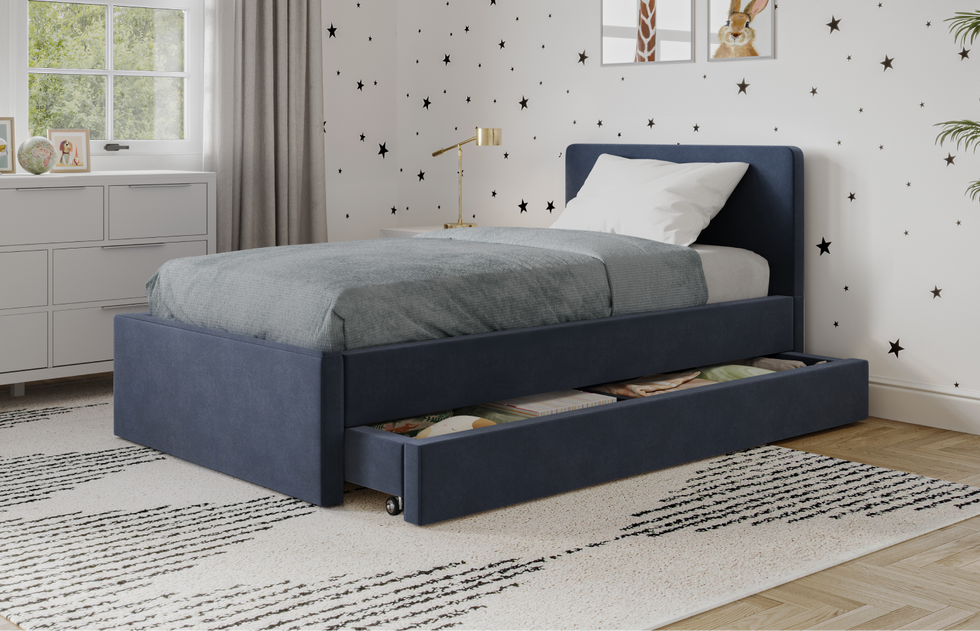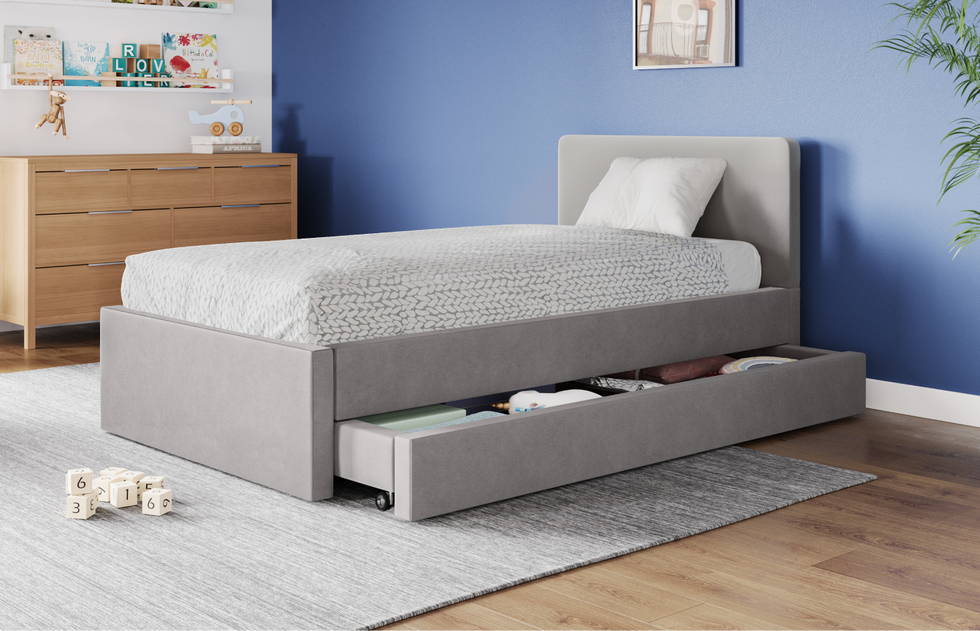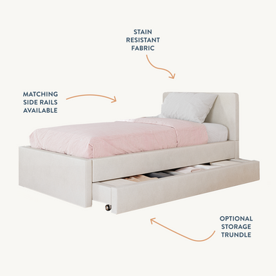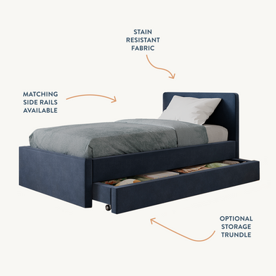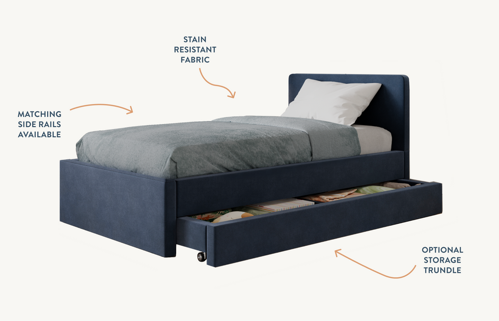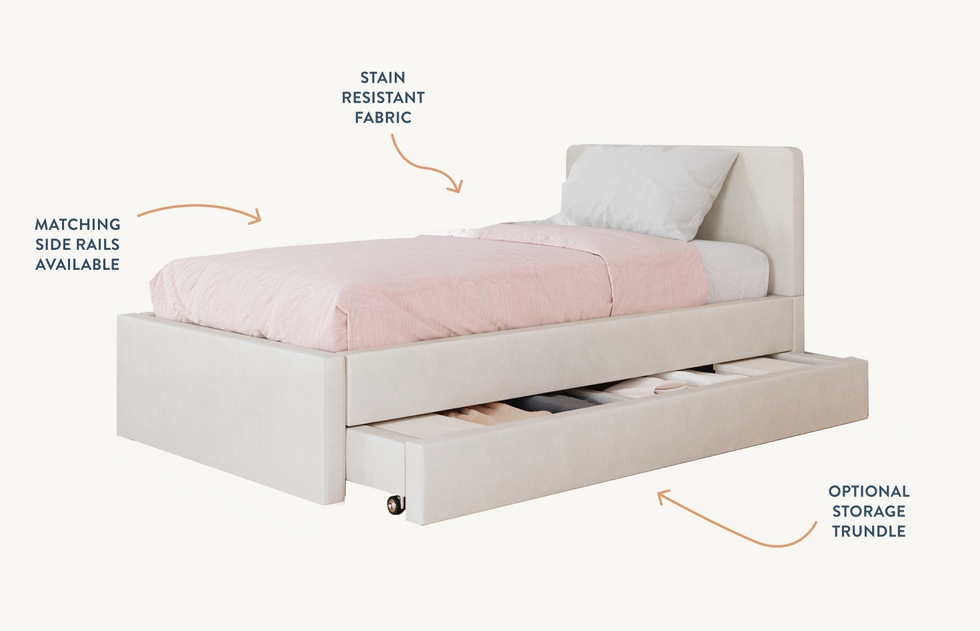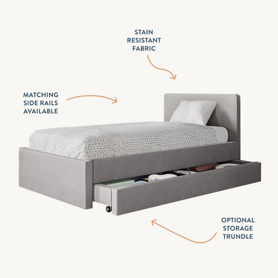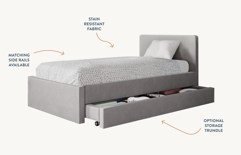 The bed features rounded corners in our signature stain-resistant fabric to keep your little one safe and cozy, and our matching add-ons allow this bed to grow with your family be it by adding safety guard rails or a storage trundle.