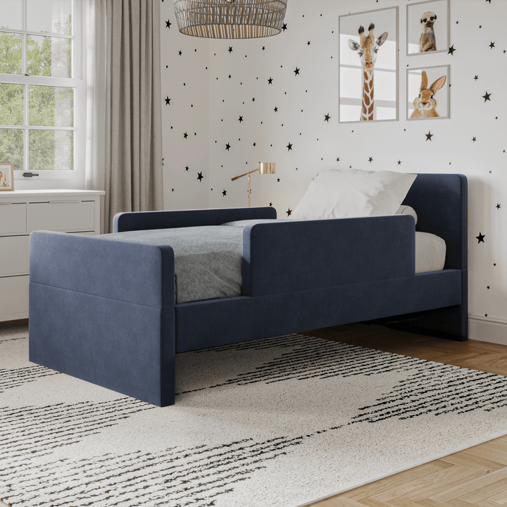 The bed features rounded corners in our signature stain-resistant fabric to keep your little one safe and cozy, and our matching add-ons allow this bed to grow with your family be it by adding safety guard rails or a storage trundle.