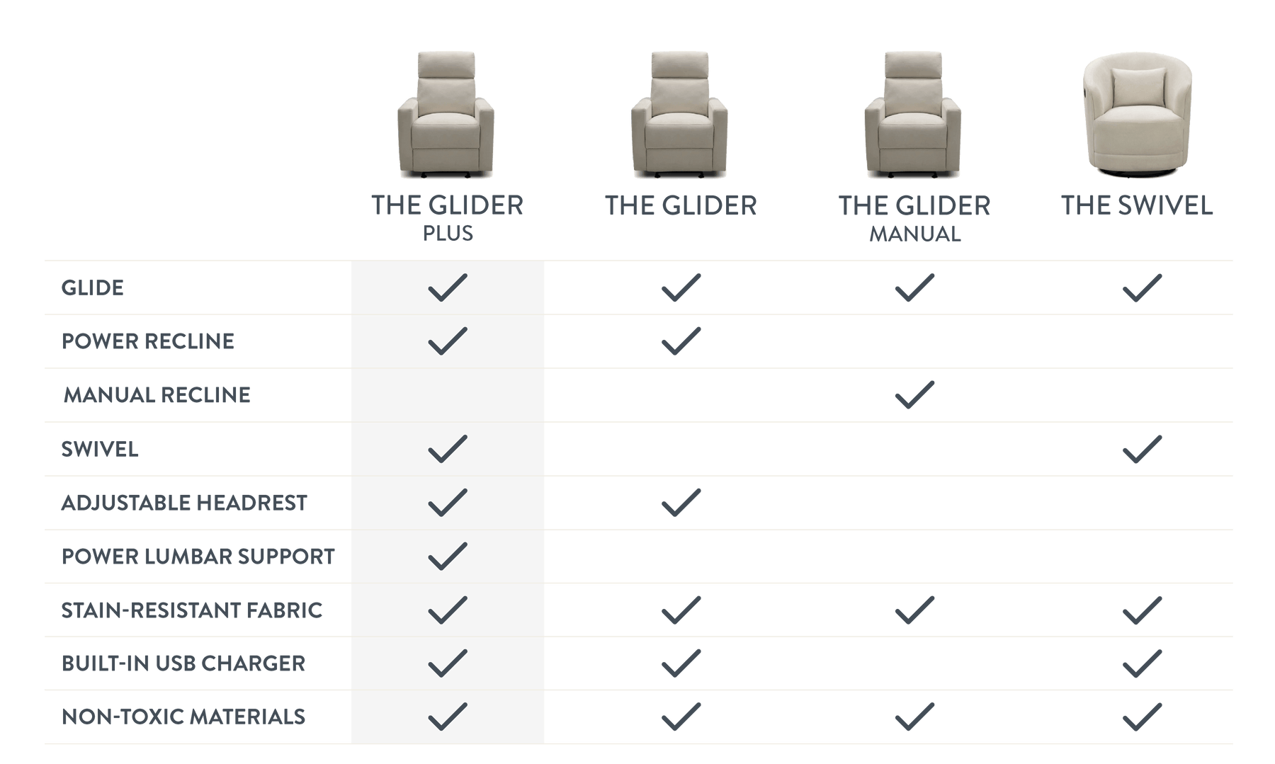 Meet our most premium nursery glider. Built with a thoughtful combination of design, function, and ultimate comfort, it has more features than any other glider on the market, including a smooth power recline and automated lumbar support for added back relief. Made with durability in mind, all gliders are upholstered in soft, performance fabric.