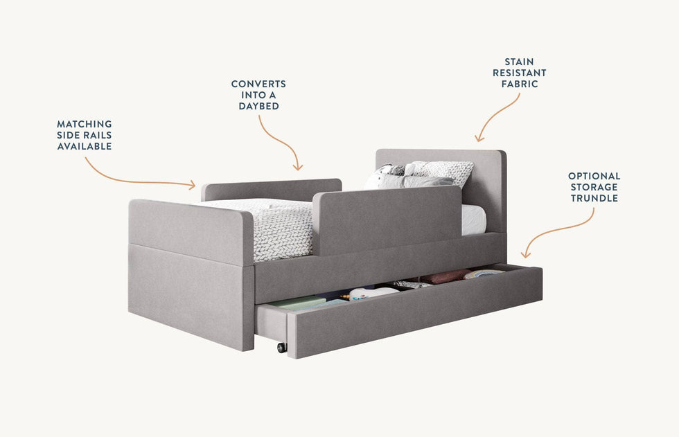 The bed features rounded corners in our signature stain-resistant fabric to keep your little one safe and cozy, and our matching add-ons allow this bed to grow with your family be it by adding safety guard rails or a storage trundle.